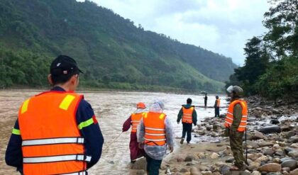 Lực lượng chức năng đang mở rộng phạm vi dọc sông Đăk Rông tìm kiếm tài xế Nguyễn Văn Thành sau khi ông bị nước lũ cuốn trôi cùng xe đầu kéo tại cầu tràn A Rông.