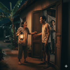 Tôi mở cửa. Trước mặt tôi là chị Lan – tóc rối bù, áo dính đầy nước mưa, mắt đỏ hoe.