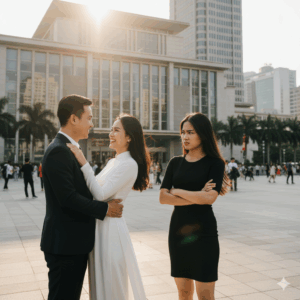 Người đàn ông bước ra khỏi cổng tòa án, gương mặt rạng rỡ một cách trâng tráo. Anh ôm chầm lấy nhân tình…