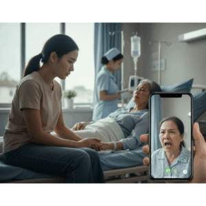 Tôi đáp, cố kiềm chế: “Con đang ở viện. Mẹ con có thể không qua khỏi hôm nay… Con không về được.”