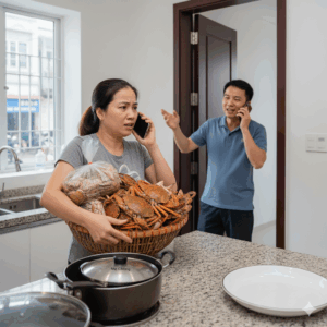 “Alô mẹ à? Nay nhà con làm đại tiệc đấy! Nó mua cả đống cua ghẹ. Mẹ với cái Hương (em chồng tôi) qua ăn cho vui nhé!”