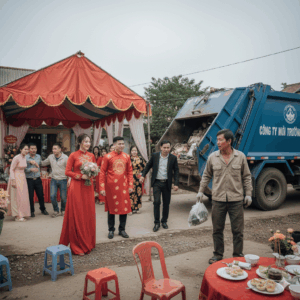 Dưới ánh nắng vàng rực rỡ của một buổi sáng mùa thu, làng quê nhỏ ven sông hào quang tăng cường bởi đám…